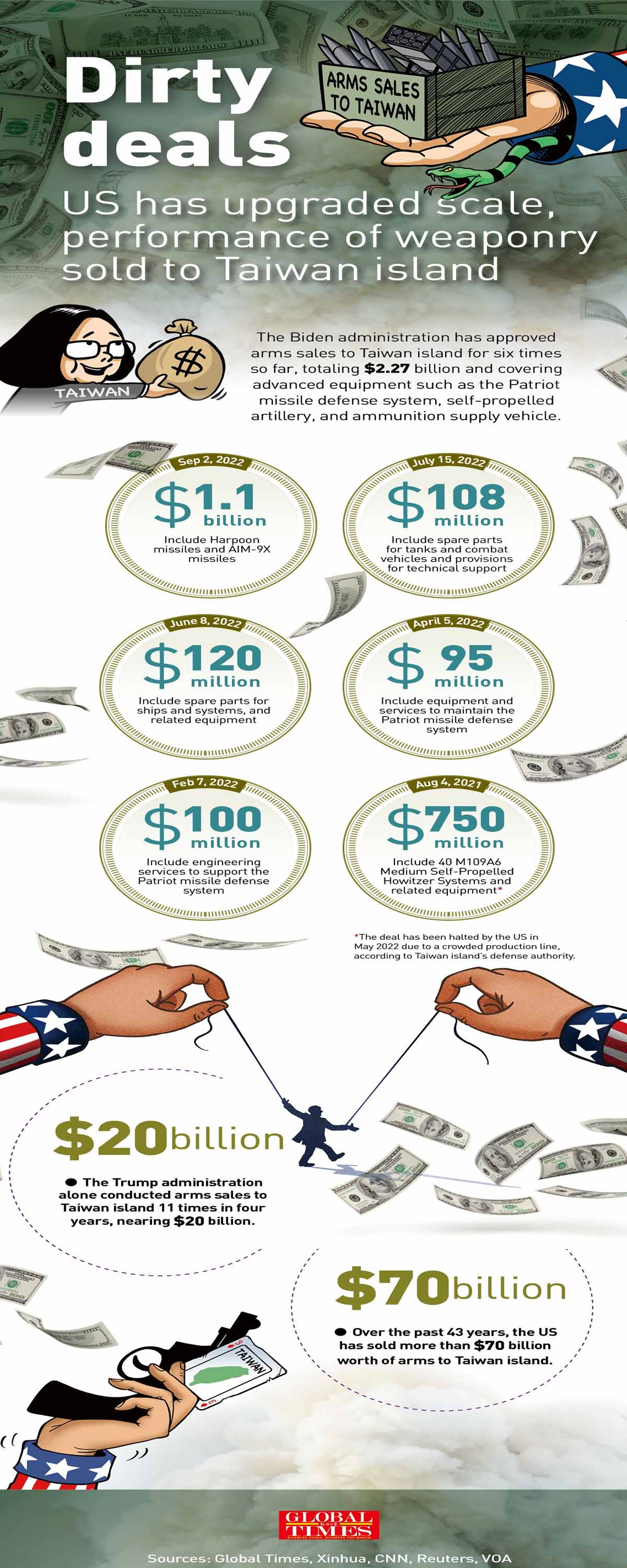 “The latest round of arms sales by the US aims to provoke China while gaining more benefits for its arms merchants, as those weapons are sold at much higher prices to the island compared to market prices,” Song Zhongping, a military expert and TV commentator, told the Global Times on Sunday.