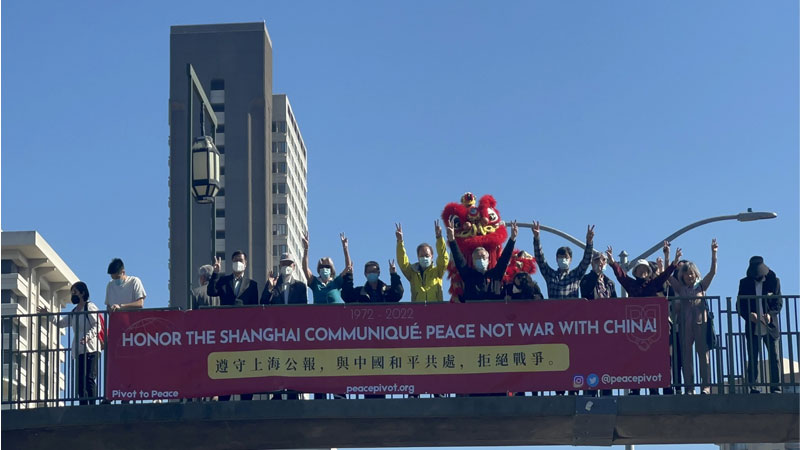 This year, for example, marks the 50th anniversary of the signing of the Shanghai Communiqué between the US and China, in which the US made a clear commitment that Taiwan is a part of China, members of Pivot to Peace put up banners saying “Honor Shanghai Communiqué” on the streets of San Francisco and gathered at local civic center to give a speech calling for the peaceful development of the two countries.