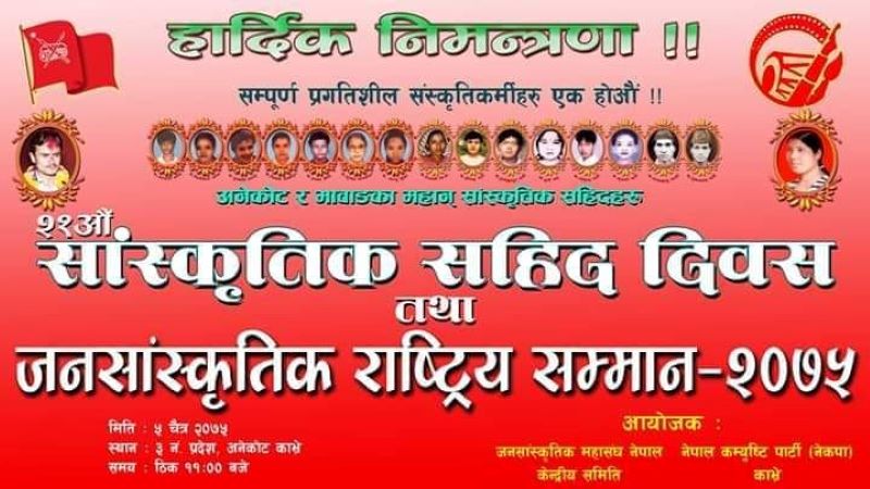 काठमाडौं, काभ्रेको अनेकोटमा आज साँस्कृतिक प्रतिरोध दिवस मनाइँदैछ । तत्कालिन सत्ताले ७ जना कलाकारलाई हत्या गरेको दिनको स्मृतिमा साँस्कृतिक प्रतिरोध दिवश मनाइने गरेको छ ।
