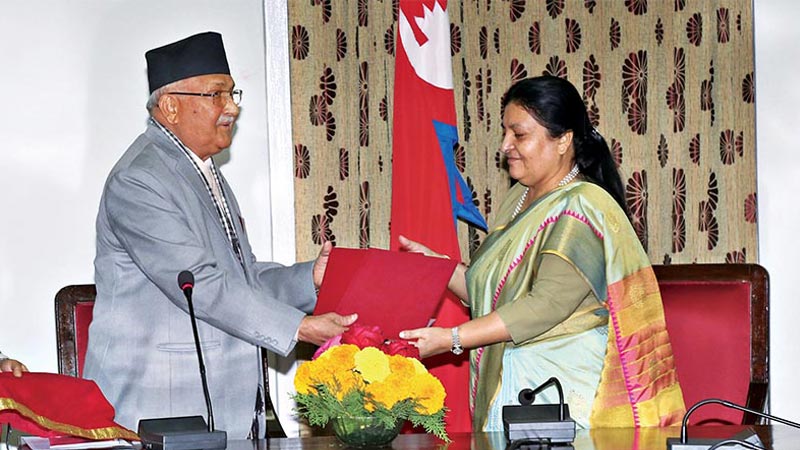 काठमाडाैं । प्रधानमन्त्री केपी शर्मा ओलीले राष्ट्रपति विद्यादेवी भण्डारी समक्ष नेपाल सरकारको आर्थिक वर्ष २०७४-७५ वार्षिक प्रतिवेदन पेश गरेका छन् । राष्ट्रपति भवन शीतलनिवासमा सोमबार आयोजित विशेष समारोहमा राष्ट्रपति भण्डारी समक्ष प्रधानमन्त्री ओलीले सरकारको वार्षिक प्रतिवेदन पेश गरेका हुन् ।